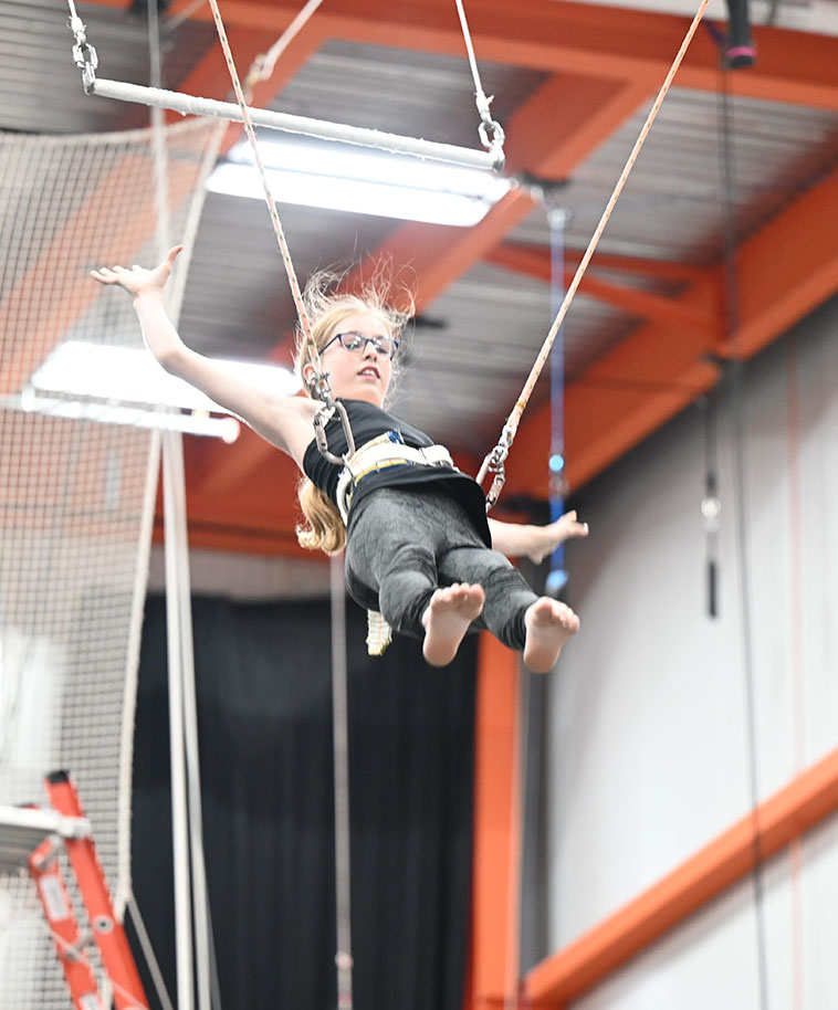 More experienced flyers will continue to work on fundamentals and on advancing their trick vocabulary. In the last half hour of class, flyers who are ready will be able to take their tricks across to a catcher (one of their coaches) swinging from a second trapeze.