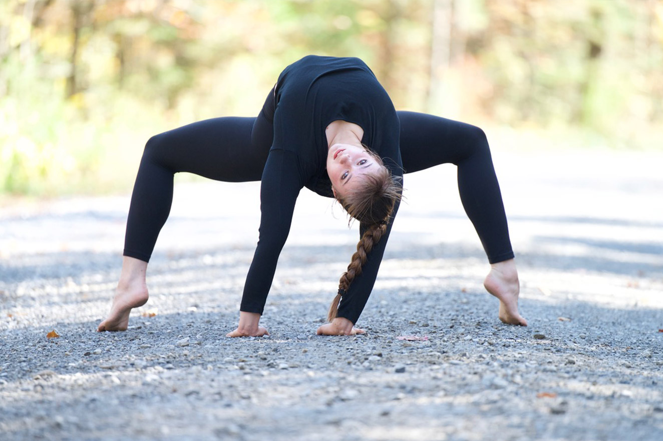 • Back bridge from standing (hold 10 seconds without adjusting. Modify with supports or a spot as needed). Stay in your bridge and shift over hands to open shoulders (hold 10 seconds). Tighten your bridge to your capacity (hands as close to feet as possible and hold for 10 seconds). Adjust as needed and rise to standing (with modifications or supports/spotting as needed). Camera viewing from the side.